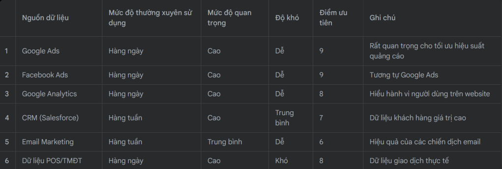 - Mức độ quan trọng: Dữ liệu nào có tác động lớn nhất đến hiệu quả chiến dịch, ROI, hay hiểu biết về khách hàng?