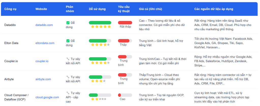 - Sử dụng các API/ Connectors: Đây là những “cây cầu” tự động hóa việc trích xuất và tải dữ liệu từ các nguồn về data warehouse. Mình có nhờ AI tổng hợp và đánh giá một số lựa chọn dưới đây để bạn tham khảo nhé